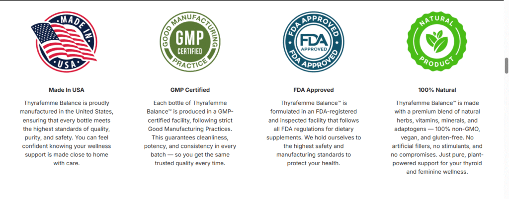 Thyrafemme Balance contains all-natural, premium-sourced, plant-based ingredients and has no GMOs, soy, dairy, or toxic additives. It is vegan-friendly, safe, and well-tolerated by users. In addition, the company manufactures in an FDA-registered, GMP-certified facility in the USA. Before taking Thyrafemme Balance, consult with a healthcare practitioner for approval.